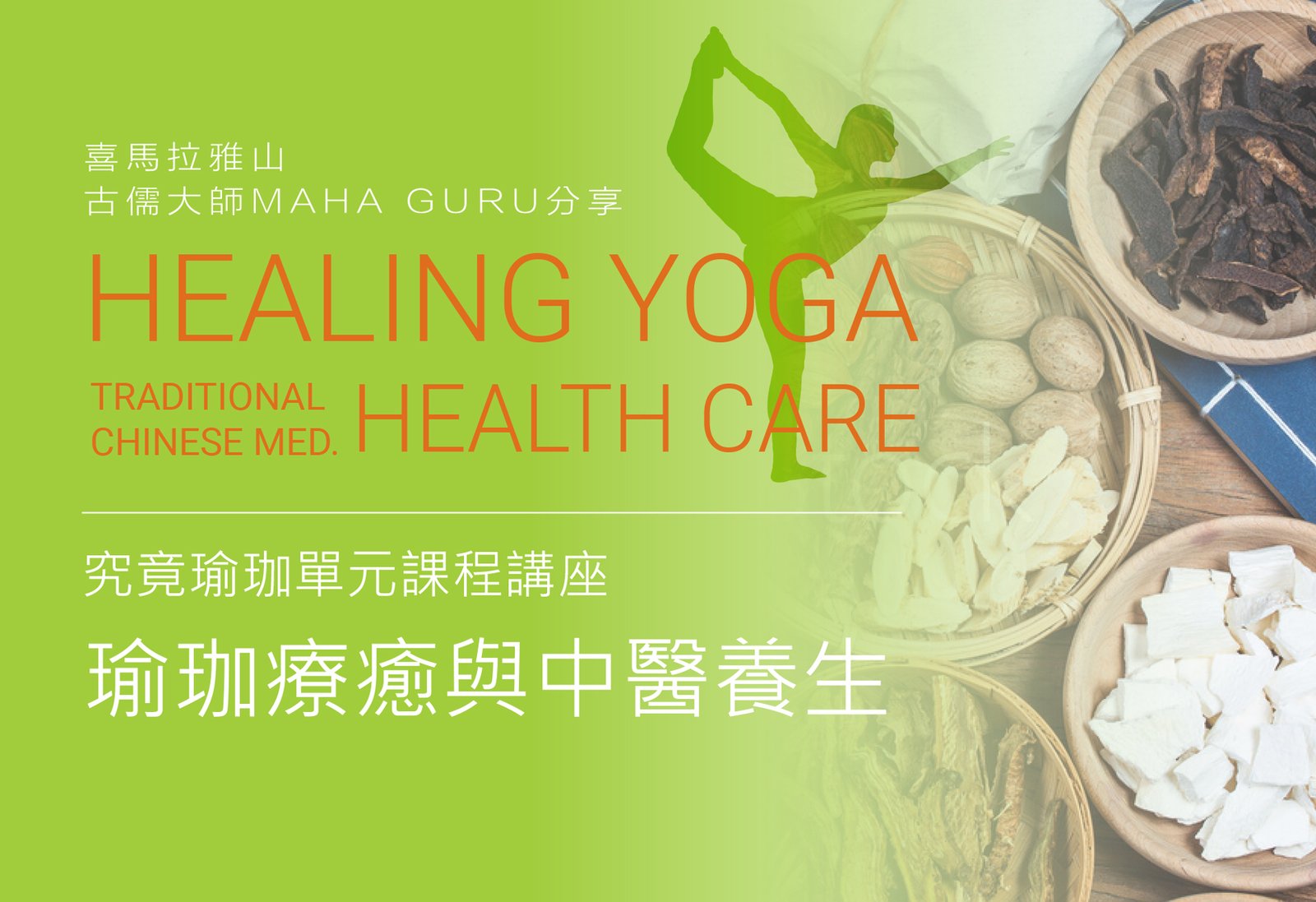 This course is conducted by MAHA GURU, who shares Yoga healing and Chinese health care with his experience of 40 years Yoga practice, enlightened wisdom, and background of 3 generations Chinese medicine. It helps adjust health and frequency, and inspire the powerful and beautiful wisdom in soul.